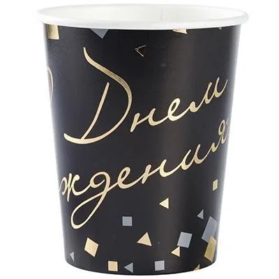 Торжественный черный с россыпью конфетти в цветах золота и серебра для самого блистательного дня рождения. В упаковке 6 праздничных стаканов с блестящим тиснением объемом 250мл.