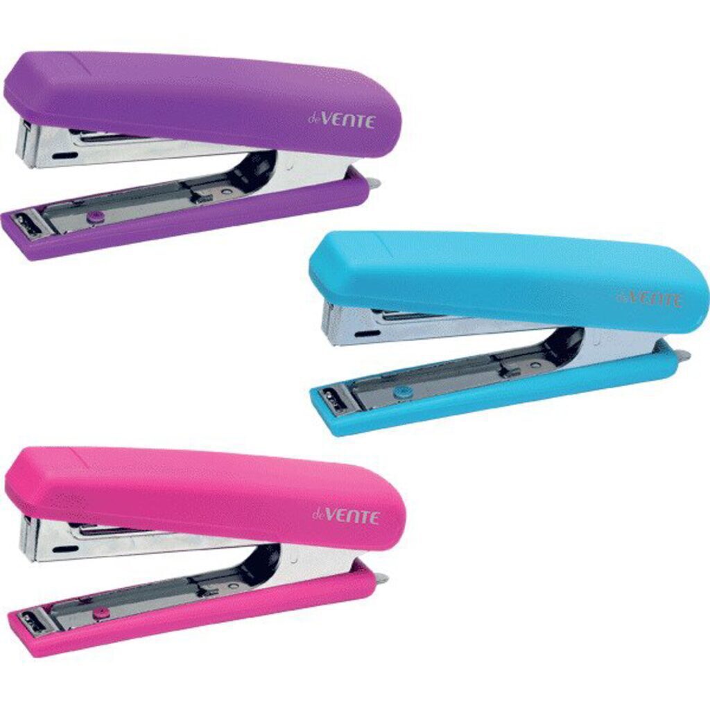 Степлер "deVENTE. Soft Touch" № 10 (мощность 12 листов) пластиковый с бархатистым прорезиненным покрытием, со встроенным металлическим антистеплером, в картонной коробке, ассорти 3 цвета (фиолетовый, голубой и розовый) Глубина сшивания 50мм