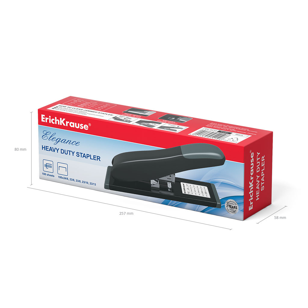 Мощный степлер для скрепления большого объема документов. Изготовлен из ударопрочного пластика с высококачественным стальным механизмом. На корпусе предусмотрена резиновая противоскользящая вставка. Максимальный объем скрепления до 100 листов достигается при использовании скоб №23/13. Вмещает до 100 скоб №24/6, 23/6, 23/8, 23/10, 23/13. Пластиковая вставка на основании не царапает поверхность стола и предотвращает скольжение степлера. Наличие регулируемого расстояния до места скрепления. Глубина закладки бумаги до 55 мм. Гарантия на механизм 2 года при условии использования скоб ErichKrause®.