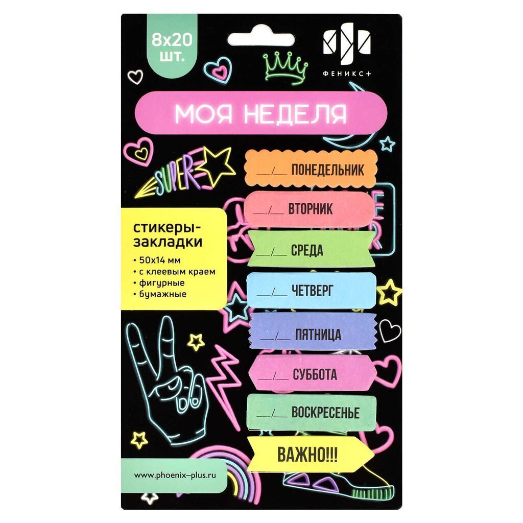 Стикеры-закладки бумажные. МОЯ НЕДЕЛЯ. Количество стикеров в наборе: 160шт. Размер: 50x14 мм. Материал - бумага. Плотность бумаги 80 г/м?. Цвет(а): жёлтый, зелёный, красный, оранжевый, розовый, синий. Количество цветов - 8. Форма: фигурная. Количество каждой формы: 20. Количество каждого цвета: 20. Наличие диспенсера - нет. Индивидуальная упаковка: подложка с европодвесом из мелованного картона + ПЭТ-пакет.