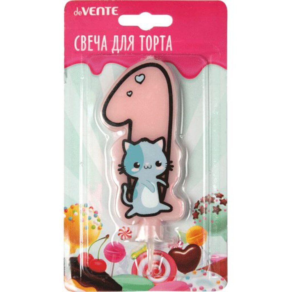Свеча-цифра для торта "deVENTE. Котик" 1, размер свечки 9,1x6,6x1 см, с рисунком, розовая, в картонном блистере