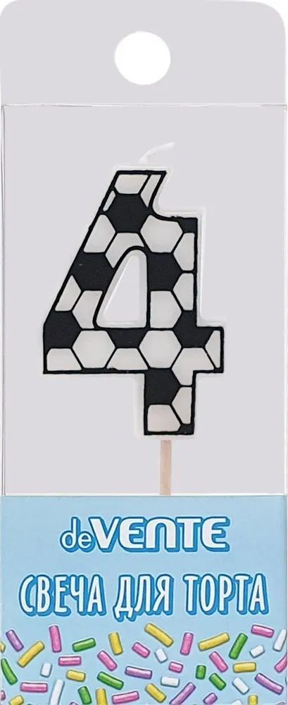 Свеча-цифра для торта "deVENTE. Футболист" 4, размер свечки 5x3,5x0,8 см с черно-белым рисунком, в пластиковой коробке с подвесом