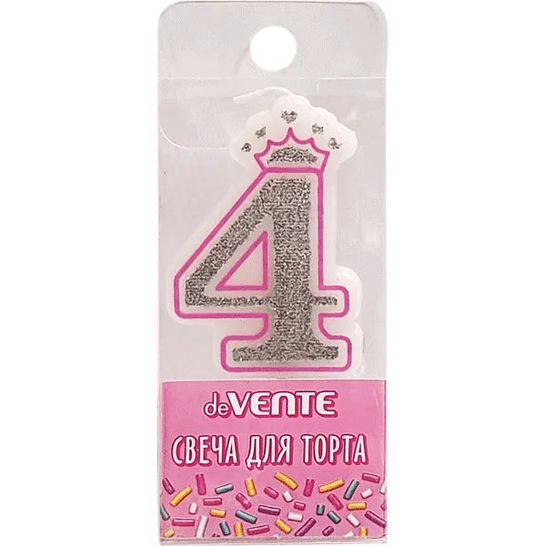 Свеча-цифра для торта "deVENTE. Розовая принцесса" 4, размер свечки 5,8x3,8x0,8 см с серебряным рисунком, в пластиковой коробке с подвесом