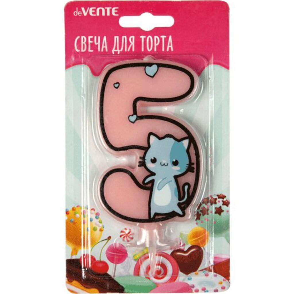 Свеча-цифра для торта "deVENTE. Котик" 5, размер свечки 9,1x6,6x1 см, с рисунком, розовая, в картонном блистере