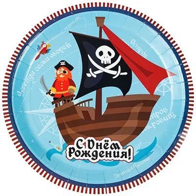 Остров, полный сокровищ – предел мечтаний каждого пирата! Создавай пиратский квест, ищи пиастры и дублоны по карте Флинта! Приключения начинаются. В упаковке 6 бумажных ламинированных тарелок размером 23см.