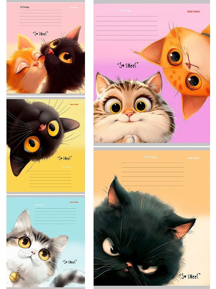 Тетрадь А5 12л косая лин. с доп.горизонт.лин. Проф-Пресс "Кошачьи мордочки - 4" 5диз.в сп.