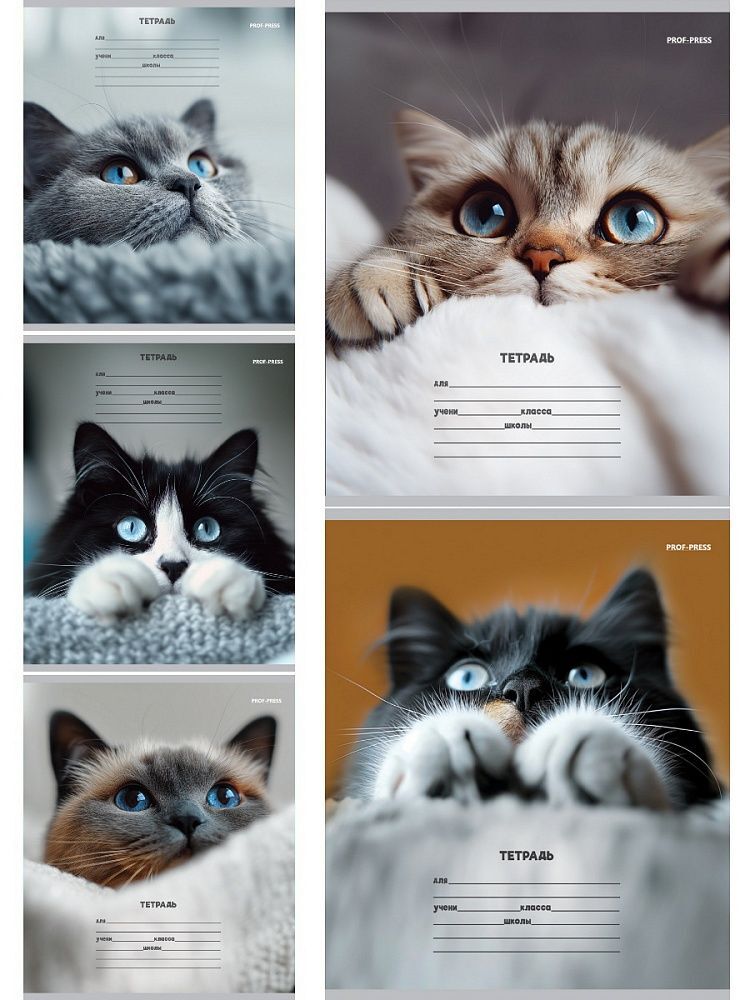 Тетрадь А5 12л косая лин. с доп.горизонт.лин. Проф-Пресс "Кошачьи мордочки" 5диз.в сп.