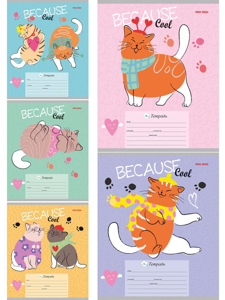 Тетрадь А5 12л лин. Проф-Пресс "Большие котики" твин-лак, 5 диз.в спайке, белизна 100%