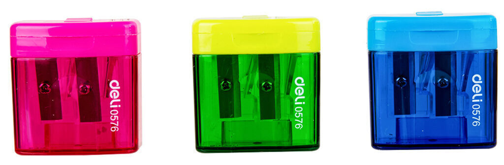 Пластиковая точилка с тонированным контейнером для сбора стружки для заточки стандартных чернографитных и цветных карандашей. Отверстие для карандашей дополнительно закрывается крышкой.