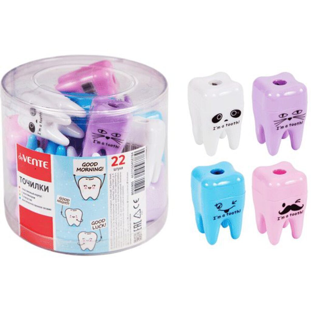 Пластиковая точилка с необычной формой в виде зуба, с контейнером для сбора стружки. Предназначена для заточки стандартных чернографитных и цветных карандашей.
