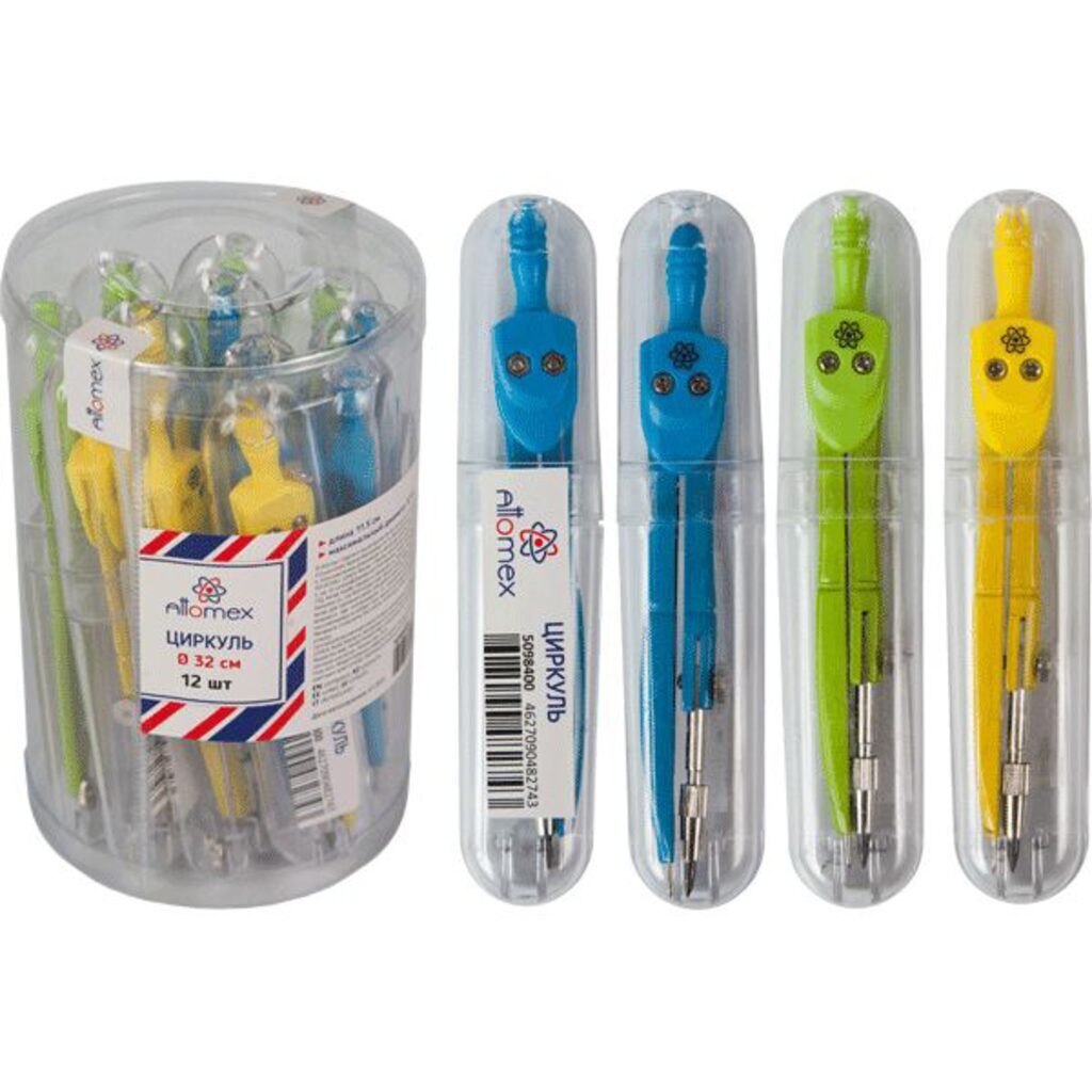 Циркуль "Attomex. Color". Материал: цинк, макс. диаметр круга: 34 см, длина циркуля: 12,5 см, диаметр штифта: 3,5 мм Цвет пластика и корпуса: ассорти. Упаковка: пластиковый футляр.