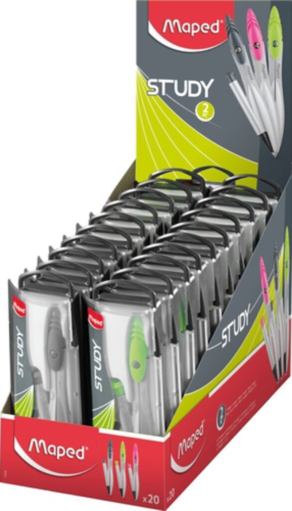 Циркуль Study.Комплект: циркуль с механическим карандашом 0.5 мм, упаковка грифелей 0.5 мм. Длина циркуля 12 см. Металлические штанги. Футляр со сдвигающейся крышкой