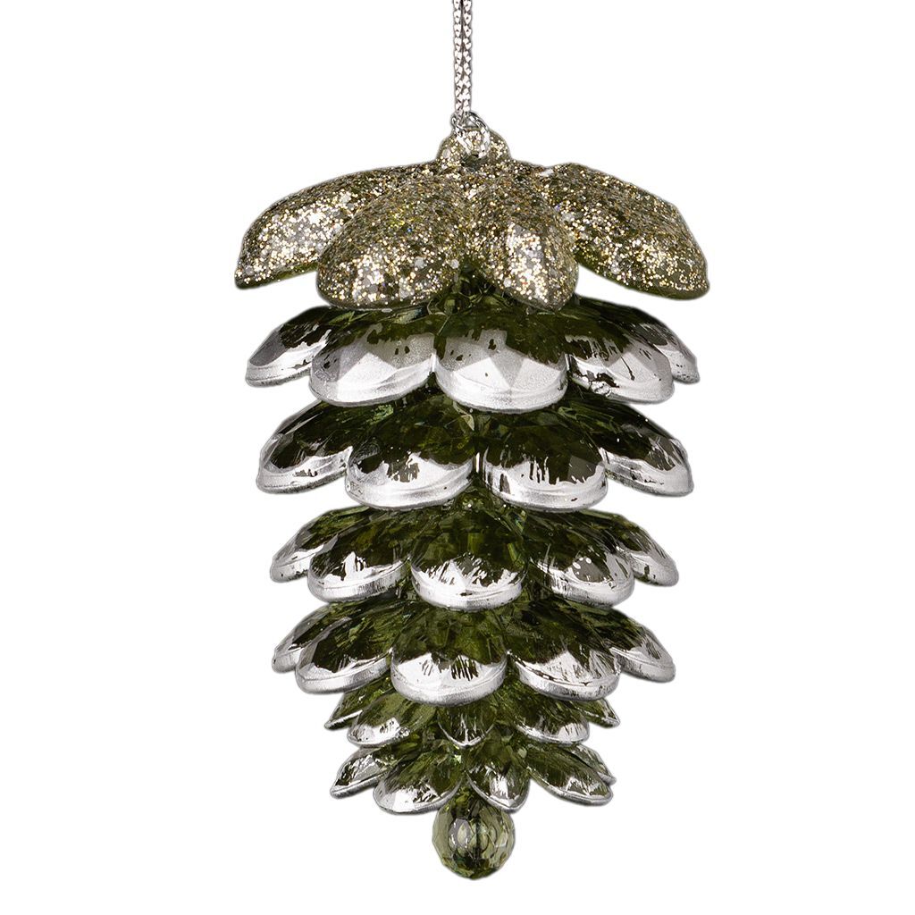 Шишка выполнена из прозрачного пластика с зеленым отливом. Края изделия покрыты серебряной краской. Верхушка усыпана сверкающими блестками. Звенья шишки крутятся. Техническая упаковка - полибэг, только для безопасной транспортировки и хранения.