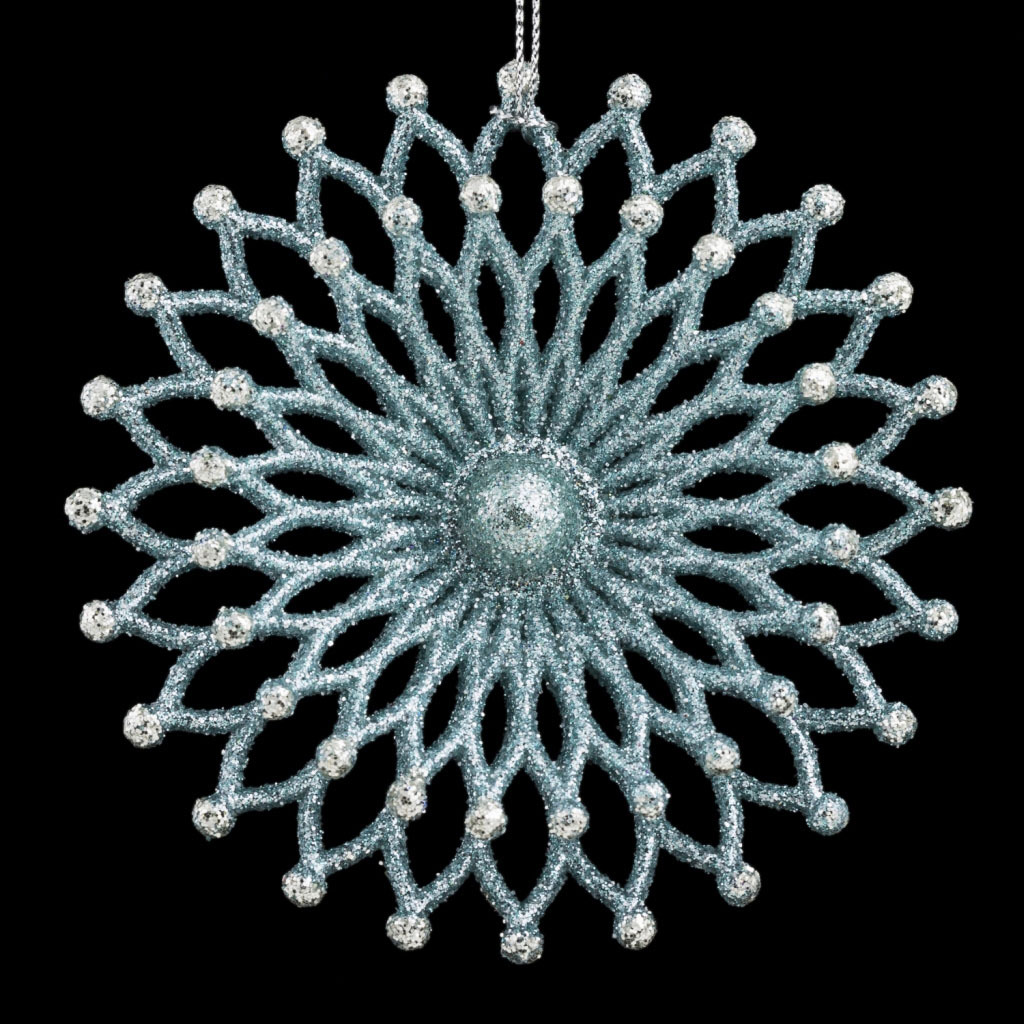 Лучистая двухслойная снежинка выполнена в нежно-голубом цвете и декорирована серебряными блестками. За счет необычного дизайна украшение эффектно смотрится на елке. Техническая упаковка - полибэг, только для безопасной транспортировки и хранения.