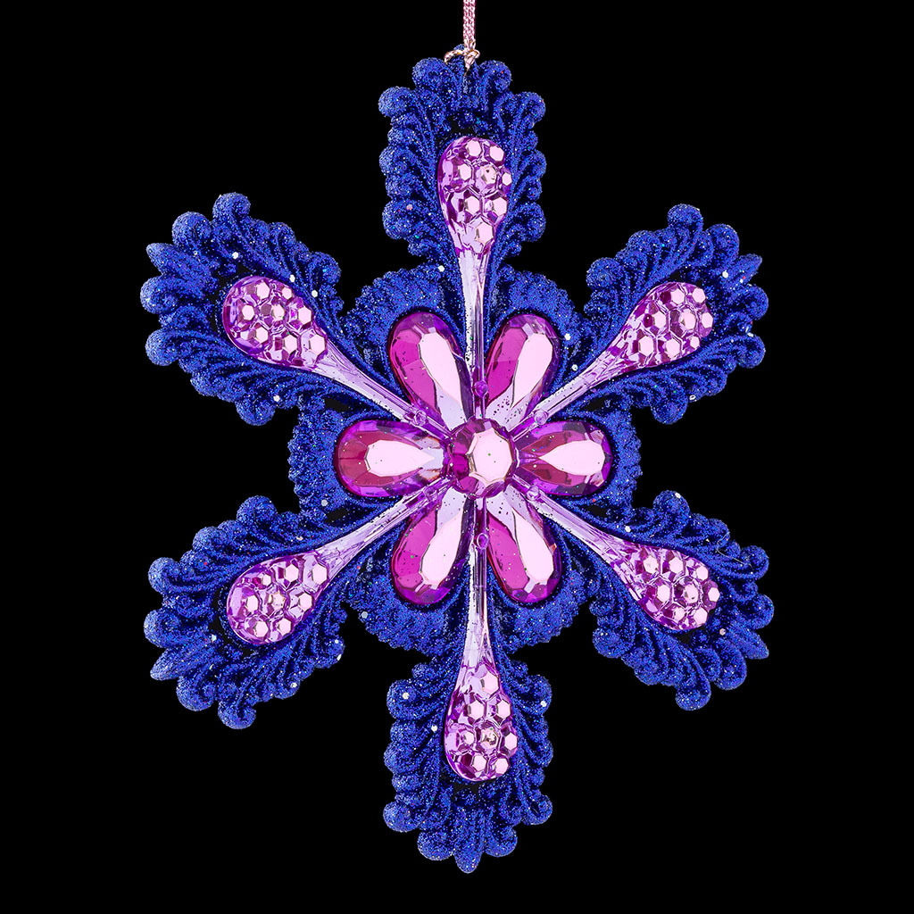 Внутрення часть снежинки декорирована крупными фиолетовыми стразами с золотыми вкраплениями. Края и обратная сторона украшения покрыты сверкающими блестками цвета аметиста. Техническая упаковка - полибэг, только для безопасной транспортировки и хранения.