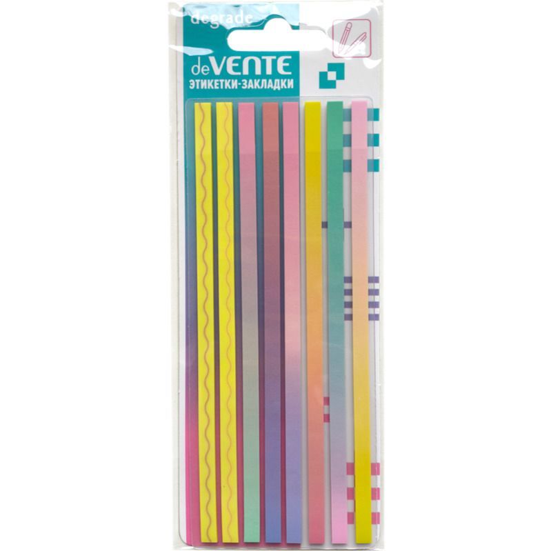 Набор самоклеящихся этикеток-закладок "deVENTE. Degre" adпластиковые полупрозрачные с дизайном, 140x5 мм, 8x20 листов, 8 дизайнов, в картонном блистере и пластиковом пакете с европодвесом, красно-оранжевая гамма
