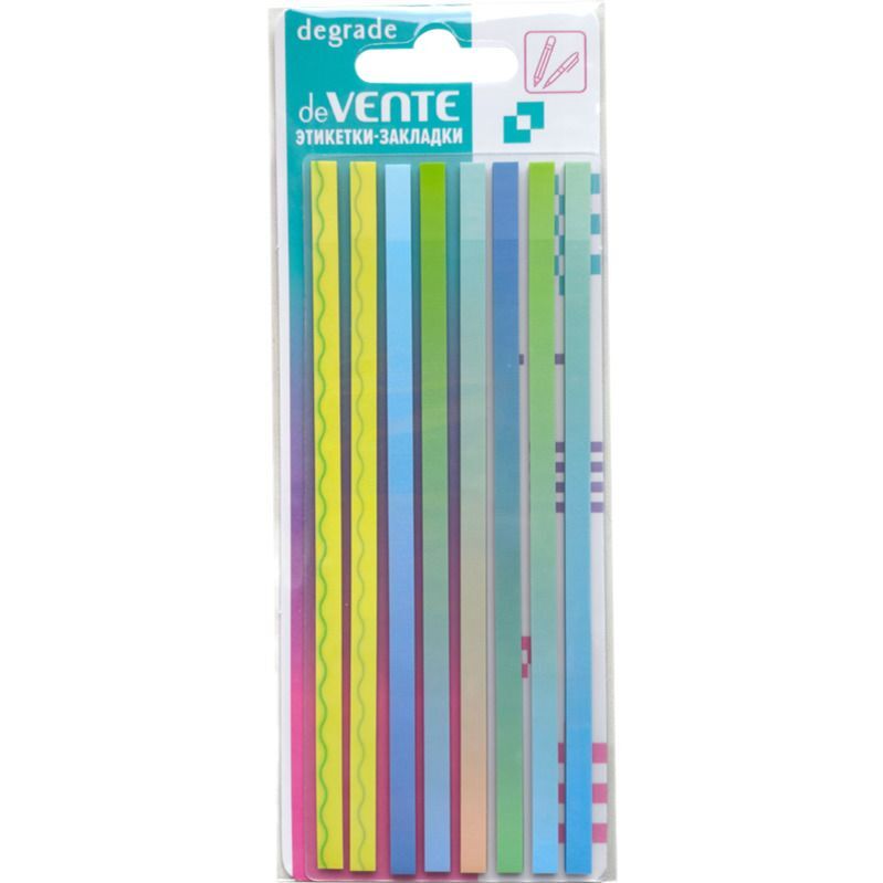 Набор самоклеящихся этикеток-закладок "deVENTE. Degrade" пластиковые полупрозрачные с дизайном, 140x5 мм, 8x20 листов, 8 дизайнов, в картонном блистере и пластиковом пакете с европодвесом, сине-зелёная гам