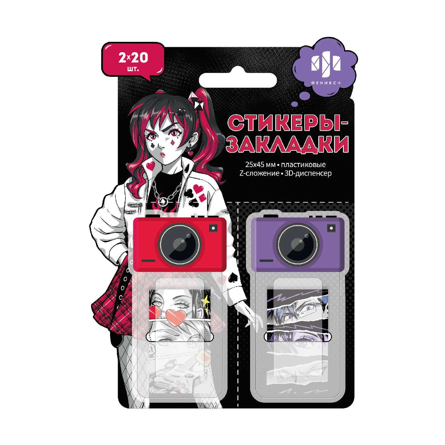 Стикеры-закладки пластиковые, 25х45 мм, 40 шт., арт. 65030 / 48 ГЕРОИ АНИМЕ КОМИКС (материал: пластик цвет: красный, фиолетовый, чёрный; кол-во цветов: 2, кол-во каждого цвета: 20, форма: прямоугольная, декор: полноцветный дизайн; тип сложения: Z-сложение; наличие диспенсера: есть, материал диспенсера: ПВХ; индивидуальная упаковка: подложка с европодвесом из мелованного картона + ПЭТ-пакет)