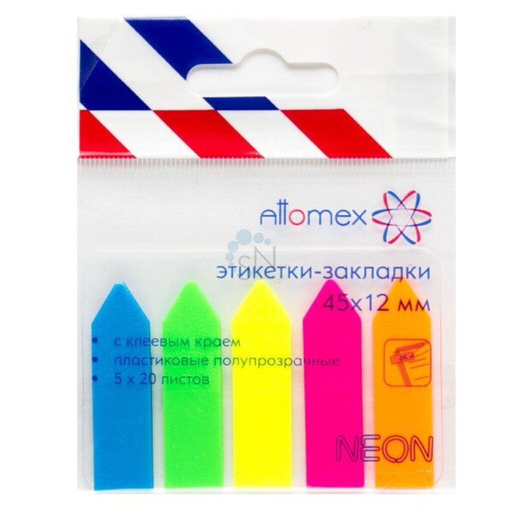 Закладки пластиковые с клеевым краем предназначены для временных пометок страниц. Размер закладки - 12х45 мм. Форма - стрелки. В упаковке 5 неоновых цветов (голубой/желтый/зеленый/оранжевый/розовый) по 20 листов. Упакованы в ПЭТ пакете с европодвесом. На закладках можно делать надписи. Изготовлены из цветной полупрозрачной полимерной пленки, которая не закрывает текст страницы. Специальный клеевой состав позволяет надежно крепить и многократно переклеивать закладки, не оставляя следов и не повреждая поверхность.