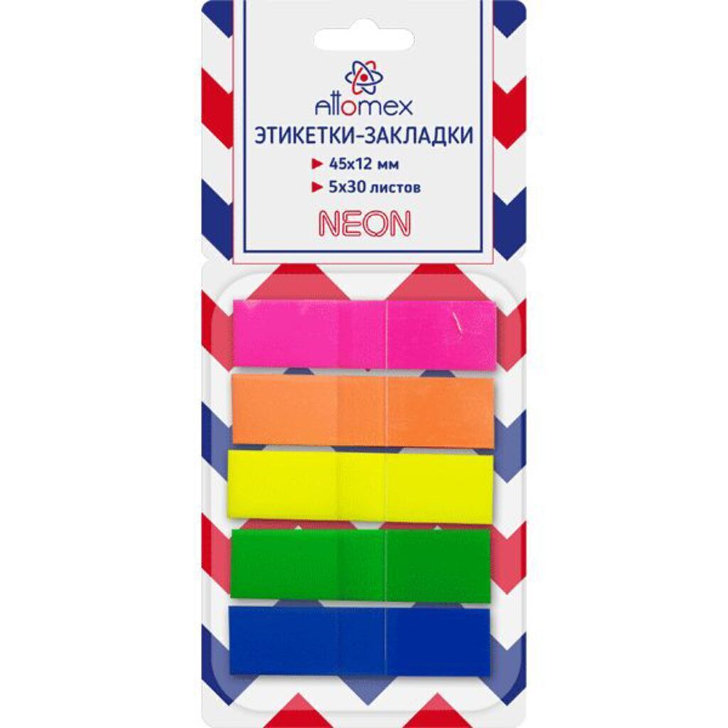 Набор самоклеящихся этикеток-закладок "Attomex" пластиковые полупрозрачные, в диспенсере Z-сложение, 45x12 мм, 5x30 листов, 5 неоновых цветов, в картонном блистере