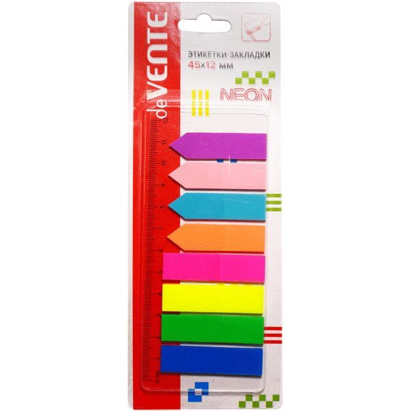 Закладки пластиковые с клеевым краем на прозрачной пластиковой линейке, предназначены для временных пометок страниц. . Размер закладки - 12х45 мм. Форма - стрелки+прямоугольник. В упаковке 4 цвета "стрелки (сиреневый/розовый/голубой/оранжевый) и 4 цвета прямоугольных (розовый/жёлтый/зелёный/синий) по 25 листов. Упакованы в картонном блистере с европодвесом. На закладках можно делать надписи. Изготовлены из цветной полупрозрачной полимерной пленки, которая не закрывает текст страницы. Специальный клеевой состав позволяет надежно крепить и многократно переклеивать закладки, не оставляя следов и не повреждая поверхность.