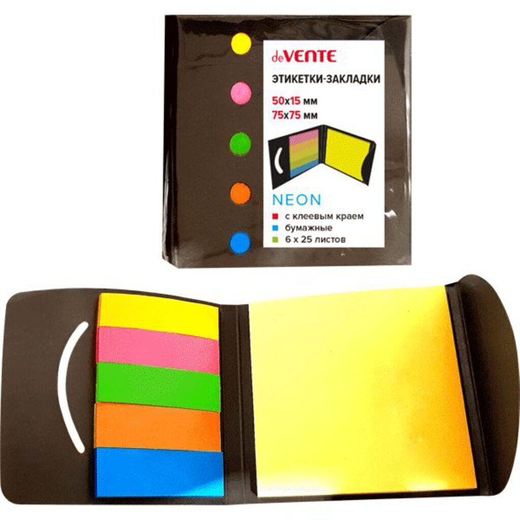 Набор самоклеящихся этикеток-закладок "deVENTE" бумажные 50x15 мм и 75x75 мм, 6x25 листов, 5 неоновых цветов, в крафт упаковке