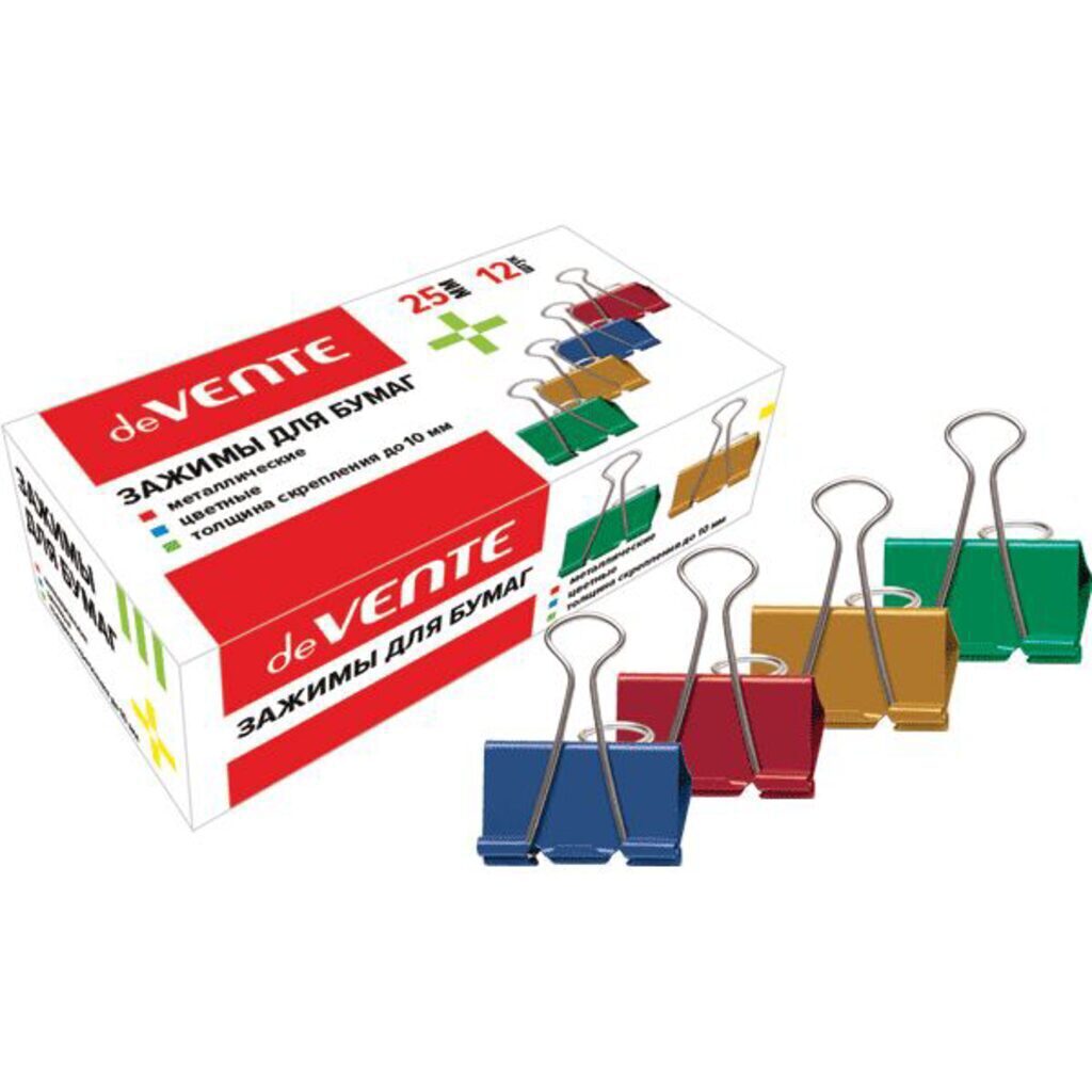 Зажим для бумаг "deVENTE" металлический (25 мм) толщина скрепления до 10 мм, цветной ассорти, 12 шт в картонной коробке
