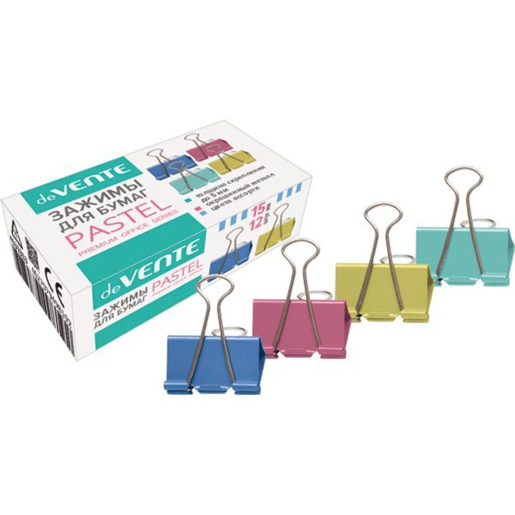 Зажим для бумаг "deVENTE" металлический (15 мм) на 45 л, цветной ассорти, 12 шт в картонной коробке
