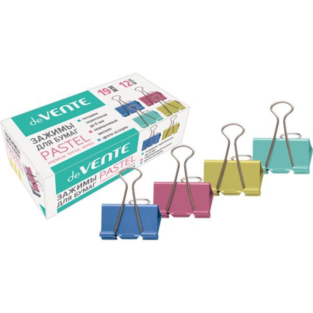 Зажим для бумаг "deVENTE" металлический (19 мм) на 60 л, цветной ассорти, 12 шт в картонной коробке