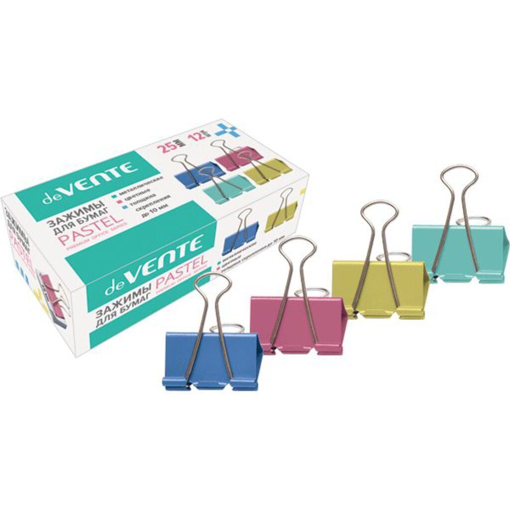Зажим для бумаг "deVENTE" металлический (25 мм) на 100 л, цветной ассорти, 12 шт в картонной коробке