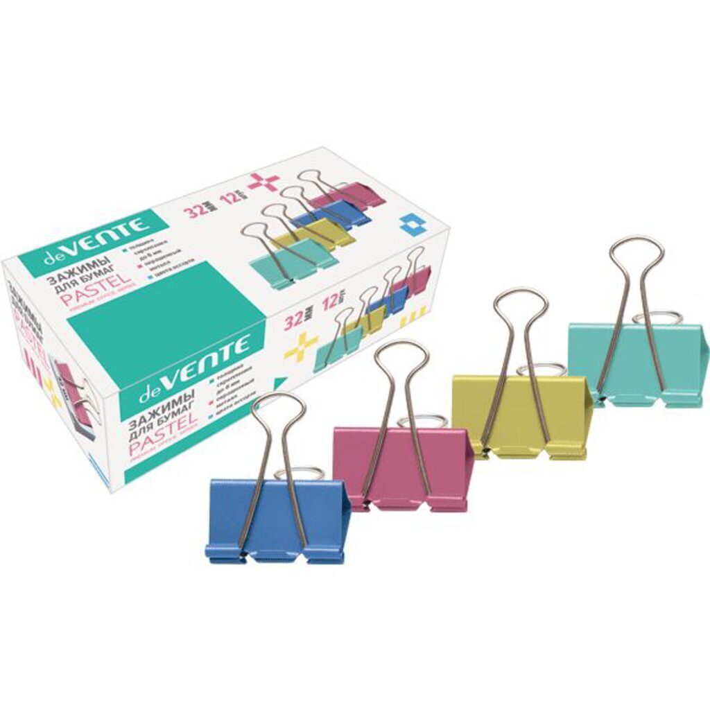 Зажим для бумаг "deVENTE" металлический (32 мм) на 140 л, цветной ассорти, 12 шт в картонной коробке